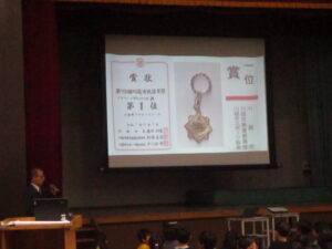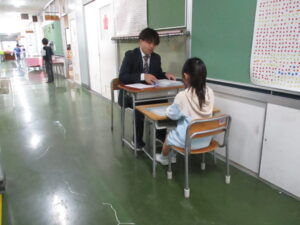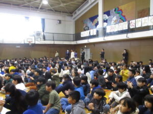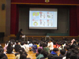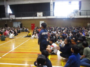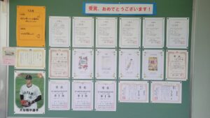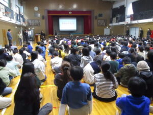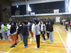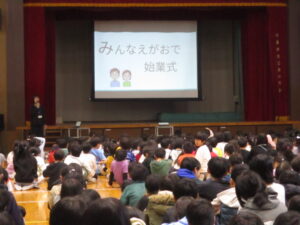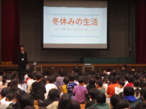 体育館で2学期の終業式が行われました。校長からは、2学期の振り返りとして、本校の校内研究で取り組んでいる単元内自由進度学習の振り返りやきょうだい学級の活動の振り返りなどをスライドを見ながらお話がありました。また、みなみ小万博の説明やSOSの出し方についてもお話がありました。表彰は、スライドに賞状と名前を映し、その場に立って拍手を送りました。今回はラグビー、ミニバスケット、サッカー、税に関する絵はがきコンクールなど、たくさんの人たちが表彰されました。賞状の写しが校長室の前に掲示されています。終業式に続いて生活指導とタブレット端末について話がありました。教室に戻った後は、担任の先生から一人一人の子供たちへ通知票「みなみの子」が言葉を添えながら手渡されました。