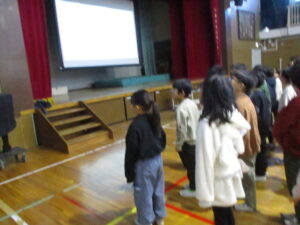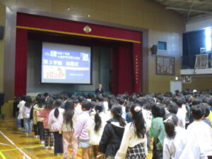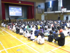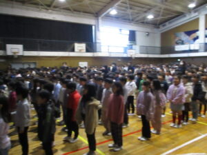 子どもたちは8時35分には体育館に整列し、始業式が始まりました。校長からは、「言霊」の話を中心に、1年のまとめをしながら次の学年の準備をすること、6年生へ感謝きもちを伝えることなどについて話がありました。最後には、元気に校歌を歌いました。寒さに負けず元気に3学期も過ごしてほしいです。