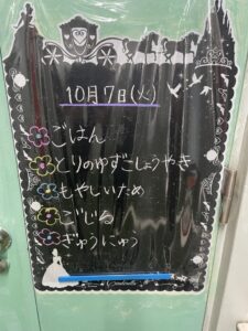 今日は、鶏肉にゆずこしょうとマヨネーズで味付けして、こんがり焼いたゆずこしょう焼きと、色々な地域で食べたれている呉汁です。呉汁は、肉や魚の手に入らない地域で、貴重なたんぱく源として食べられています。