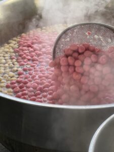 初日の今日は、具だくさんの彩りちらしと、春の七草を使ったスープ、紅白白玉ぜんざいです。