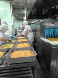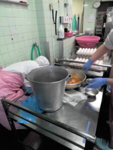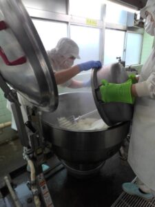 卵を連続で割っていく職人さんたちです。
