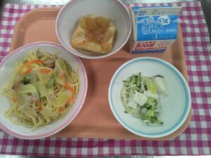 今日の朝は雪が降っていましたが、給食は春野菜を使った彩りのきれいな献立です。